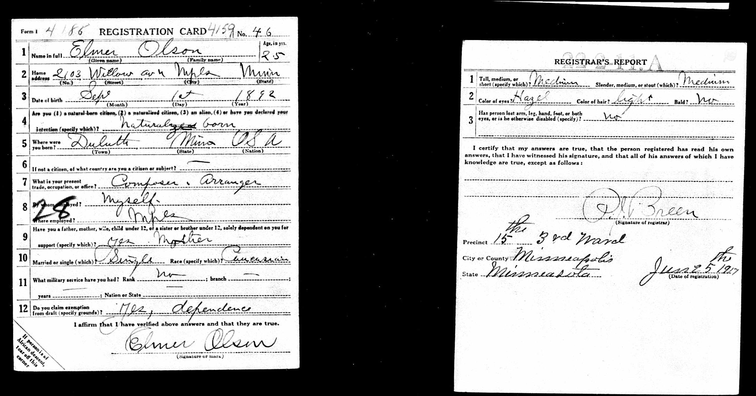 Elmer Olson was born on September 1, 1892 in Duluth, Minnesota, according to what he put on his WWI draft card: