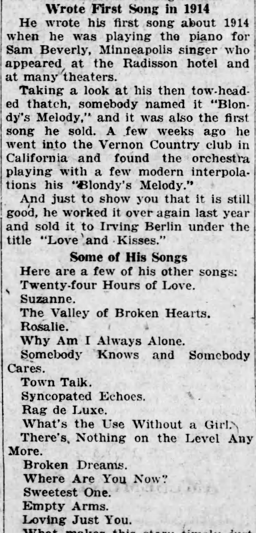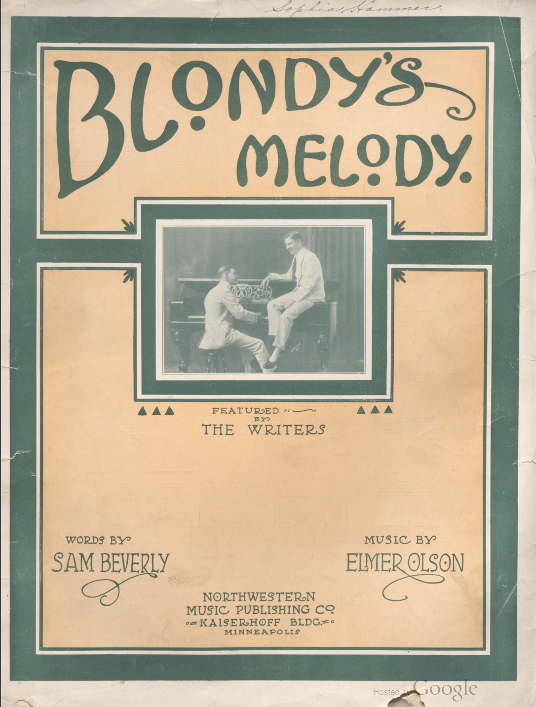 In digging around some more, I was astonished to find that Olson was not kidding at all about his first song being from 1914 and being entitled "Blondy's Melody". Here's the published sheet's cover! Complete with a photo showing Olson at the piano, with his lyricist there too.
