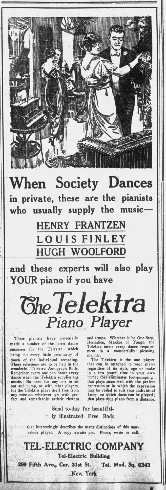 Woolford was evidently well-enough known as a pianist for dances by 1914 that the Tel-Electric company engaged him to make rolls for their Telektra system, as evidenced by the large display ad shown here, from the Brooklyn Daily Eagle of January 11, 1914. A sales point is made of the fact that the all-electric system meant that the piano would play without anyone having to pump it, so everyone could dance. Perhaps the most remarkable thing about the three pianists listed in the ad is that two of the three were Black members of the Clef Club (Woolford and Louis Finley). This serves as a reminder of how Vernon and Irene Castles' success in popularizing the then-modern dances with an orchestra of Clef Club members accompanying them had rendered Black musicians very much in demand in society circles in New York by 1914.