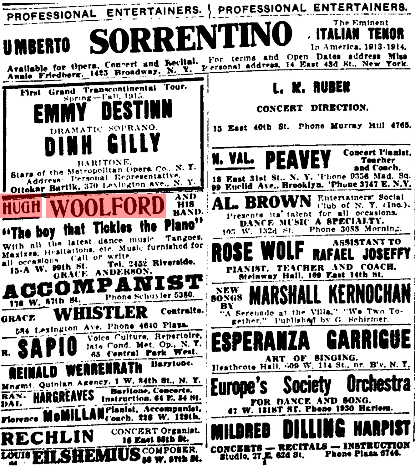 Here is an early advertisement for Woolford's band, from the New York Tribune, May 4, 1914, p. C5. Note the separate listing for Europe's band (by this time, Europe had left the Clef Club and started a new organization called The Tempo Club.)