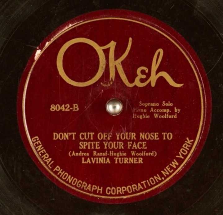 Razaf and Woolford get composer credits on the label of OKeh 8042-A and -B, a record by the classic blues singer Lavinia Turner of "How Can I Be Your 'Sweet Mama' When You're 'Daddy' To Somebody Else", backed with "Don't Cut Off Your Nose To Spite Your Face", though no copyright registration for either song has been located. These sides, recorded in late October 1922 according to Rust, are the only known phonograph records of Woolford's piano playing, for which he is credited on the labels.