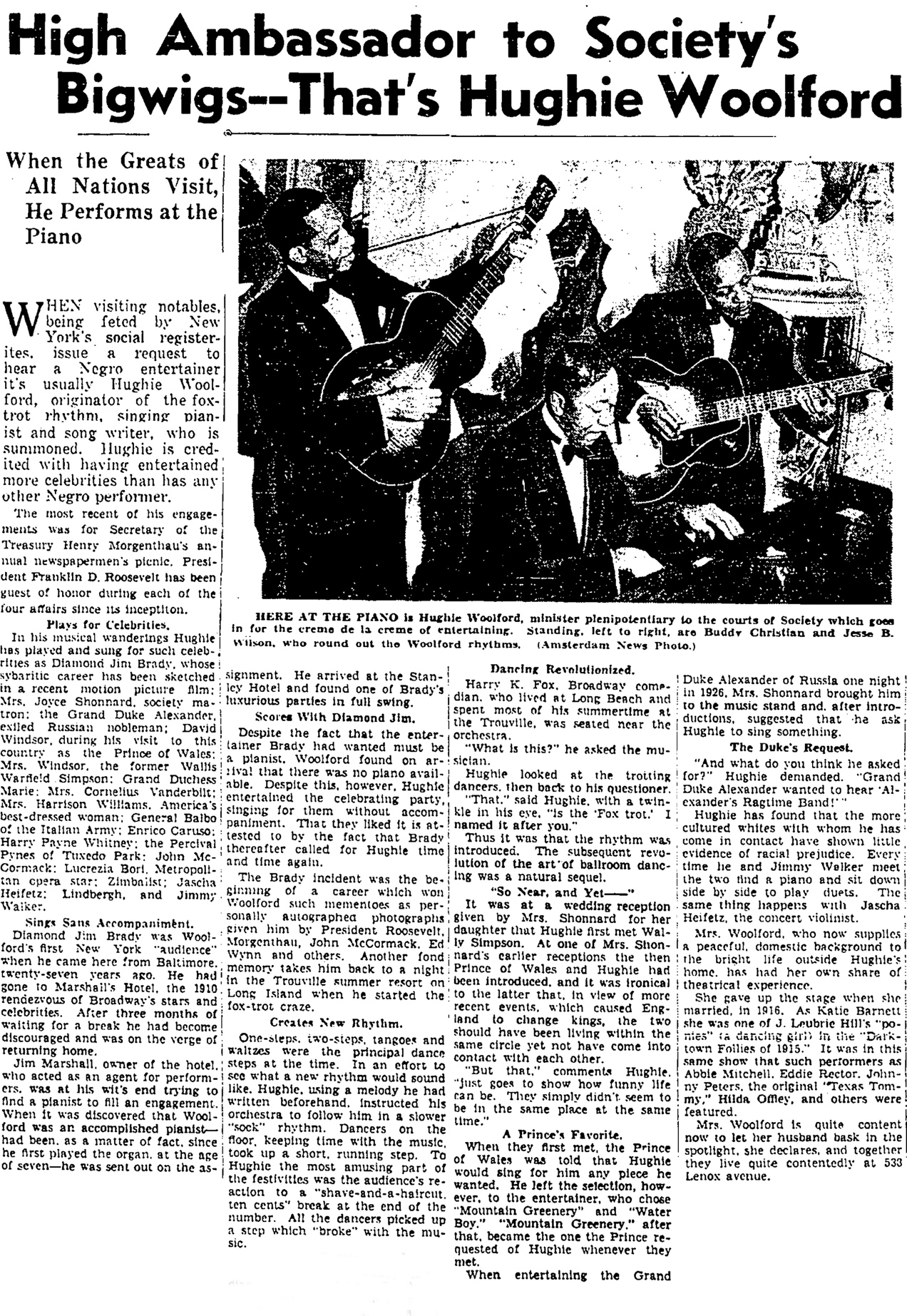 Hughie Woolford was one of the circle of Black Baltimore musicians born in the 1880s who went to New York in the 1910s and spent the rest of their career in the NY metropolitan area. The most famous of these, of course, was Eubie Blake. Garvin Bushell told Nat Hentoff ("Jazz Panorama", ed. by Martin Williams, 1964, pp. 84-85) "Baltimore had a great variety of jazz and many excellent performers. They came to New York in droves, and a large proportion of the significant figures in early New York jazz turn out to have come from Baltimore or near by. There were pianists Eubie Blake, Edgar Dow[ell], Bobby Lee, John Mitchell, banjo, Jerry Glasgow, clarinet, etc. Chick Webb later came out of Baltimore . . . Their jazz was based on ragtime piano practices, and piano ragtime influenced the way they played their horns."