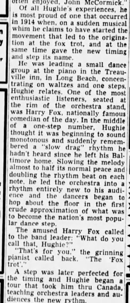 For the rest of Woolford's career, he seemed to have cited his role in the invention of the fox trot from 1914 as a memorable highlight. He told a reporter from the Asbury Park (NJ) Press (August 18, 1946), nine years later, the story, almost word-for-word the same story he had told in 1937: