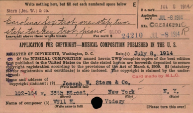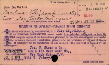 Almost exactly one year earlier, Stern had published an instrumental by Vodery with a very similar title: "The Carolina Romp", subtitled exactly the same way. Its copyright registration card: