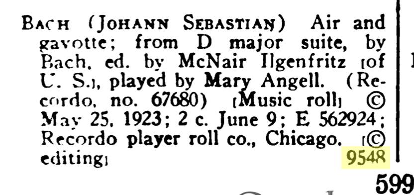 Browsing through the Catalog of Copyright Entries will yield any amount of information you want about the operations of the Imperial Player Roll Co. in the 1919-1922 period. For more examples relevant to this discussion, here is another case where Mary Angell recorded the 88-note version of a classical composition on 513650, then McNair Ilgenfritz clearly was responsible for the expression coding on Solo Carola 74125: