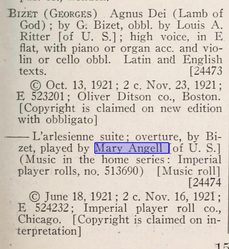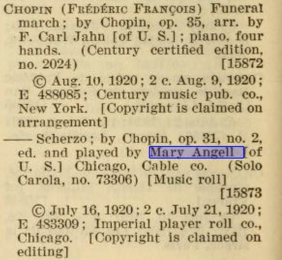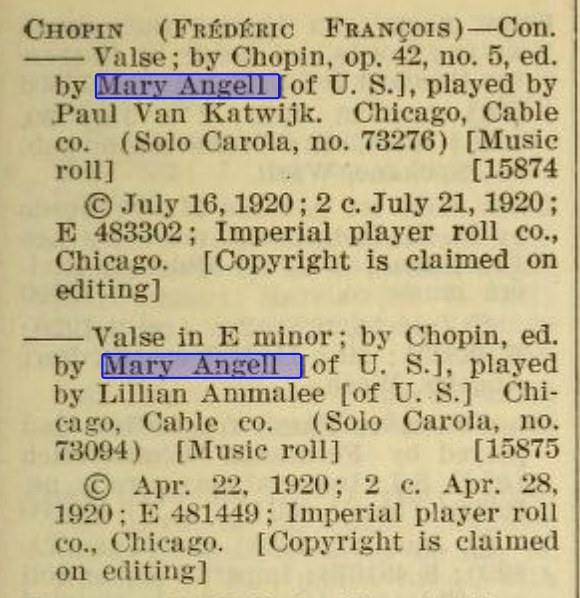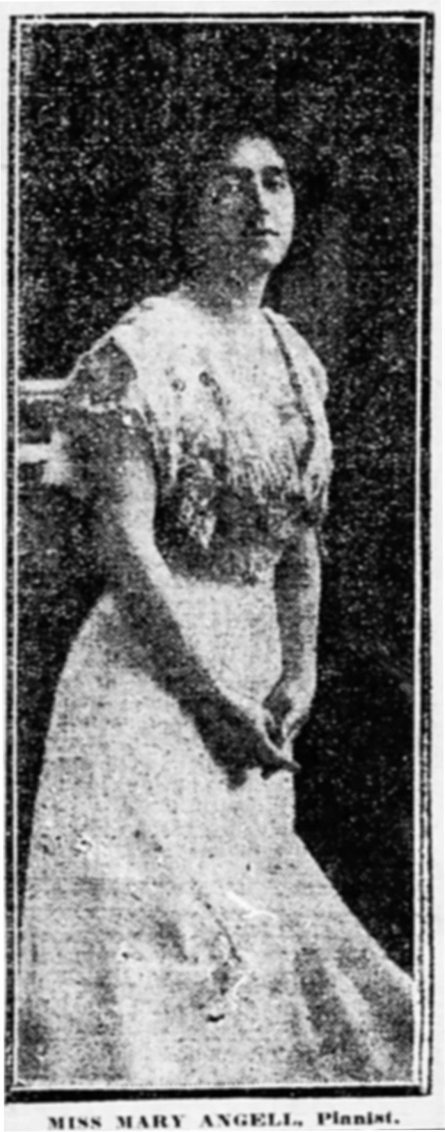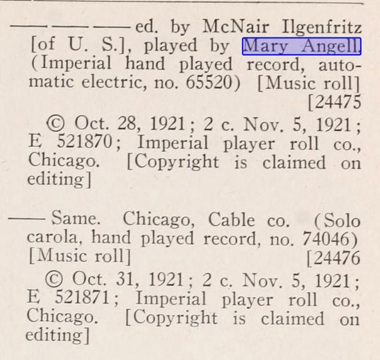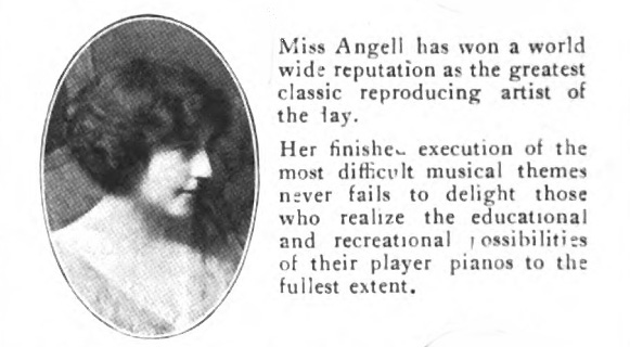 "Mary Angel [sic] was a Chicago-based pianist born ca. 1900 who made a number of excellent piano rolls for the Imperial Company. Contemporary press reports of the pre-1930 period praise her unmannered, straightforward performance style which made her well-suited to making piano rolls. She was a student of the famed teacher of Paderewski, Theodore Leschetitsky."