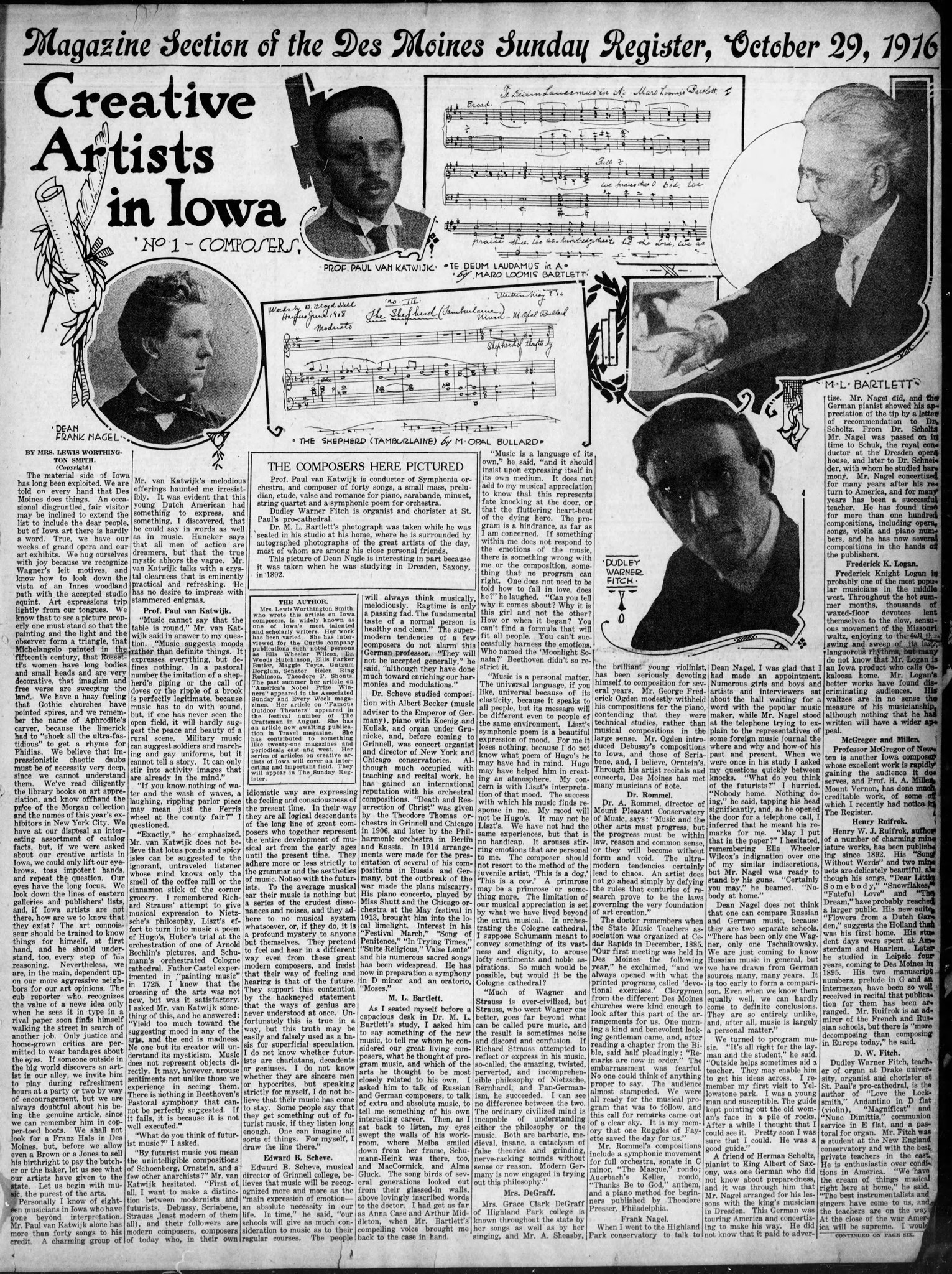 That is from the Des Moines Register in 1916 as you can see. Paul Van Katwijk was on the faculty at Drake in that Iowa city. Later he went to Austin,Texas where he seems to have spent the rest of his career. In that 1916 interview, he certainly has interesting things to say about Schoenberg's and Ornstein's music. He does not like it, in short.