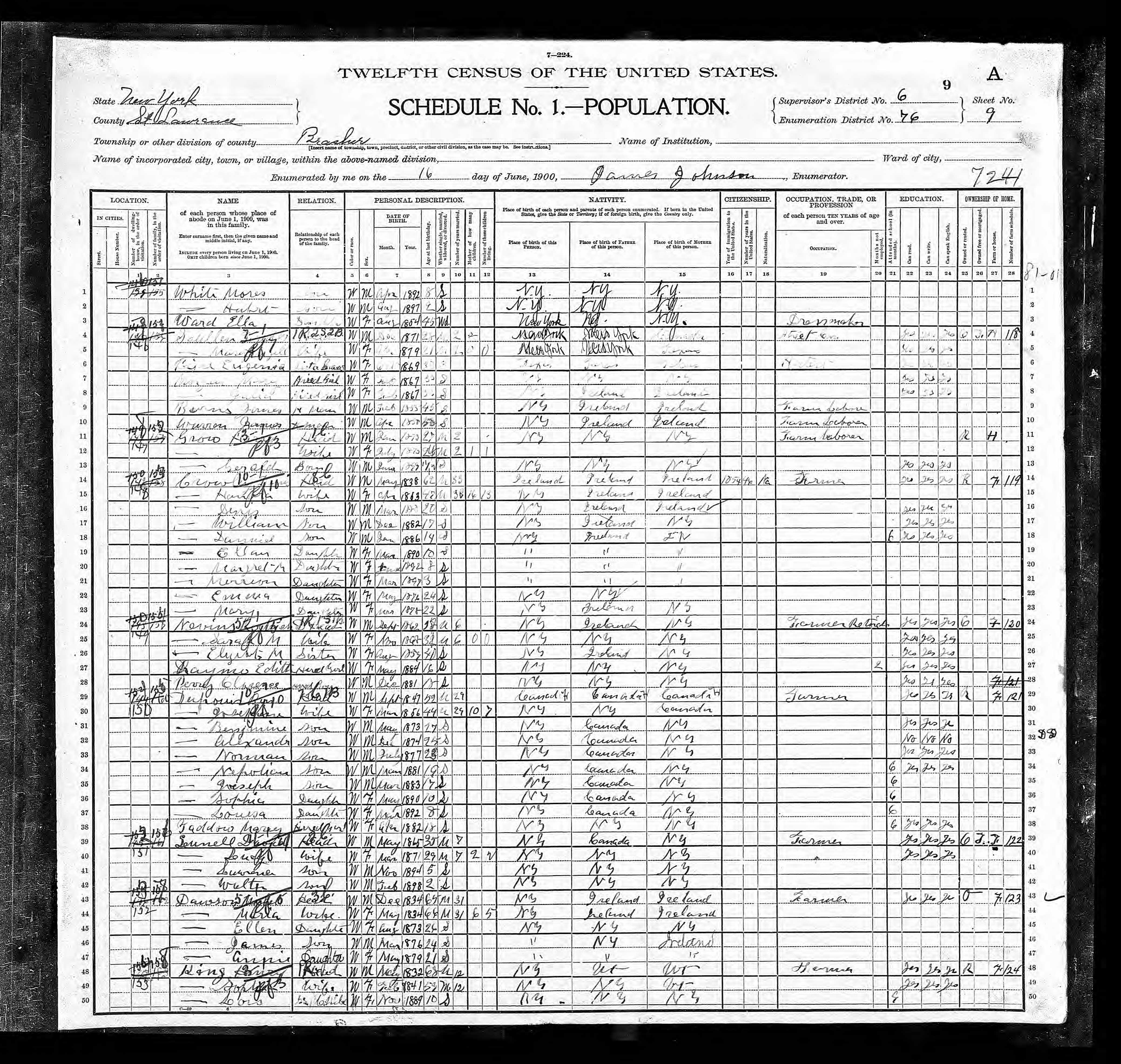 Mary Angell Scullin in 1900 census - she was born in 1879!. Note that the Scullin family is living in the town of Brasher, New York, of which a small part is Helena, as mentioned in the following obituary of Frederick Scullin. Although the overwritten notations on the part of the enumeration sheet make it very difficult to make out unambiguously, I think it may give Scullin's first name as Frederick or some variation thereof, and for his wife I believe it has a dash to indicate the same last name as above (Scullin) and first names "Mary Angell". The sister-in-law living with them is named Eugenia Price, and the fact that she's given as single, and that she is 10 years older than Mary implies that Mary's mother was married once before so that Eugenia and Mary were half-sisters. Eugenia is an "artist". (Frederick's occupation is given as "Street Car", referring to his father's business back in St. Louis.) Note that the next four entries, two women and two men, are all hired hands that presumably run the family farm referred to in the obituary.