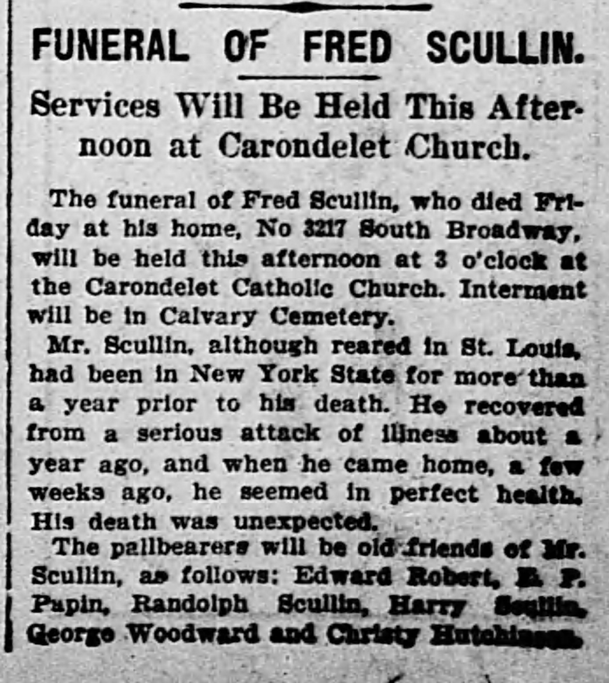 Frederick Scullin is buried in Calvary Cemetery in St. Louis.
