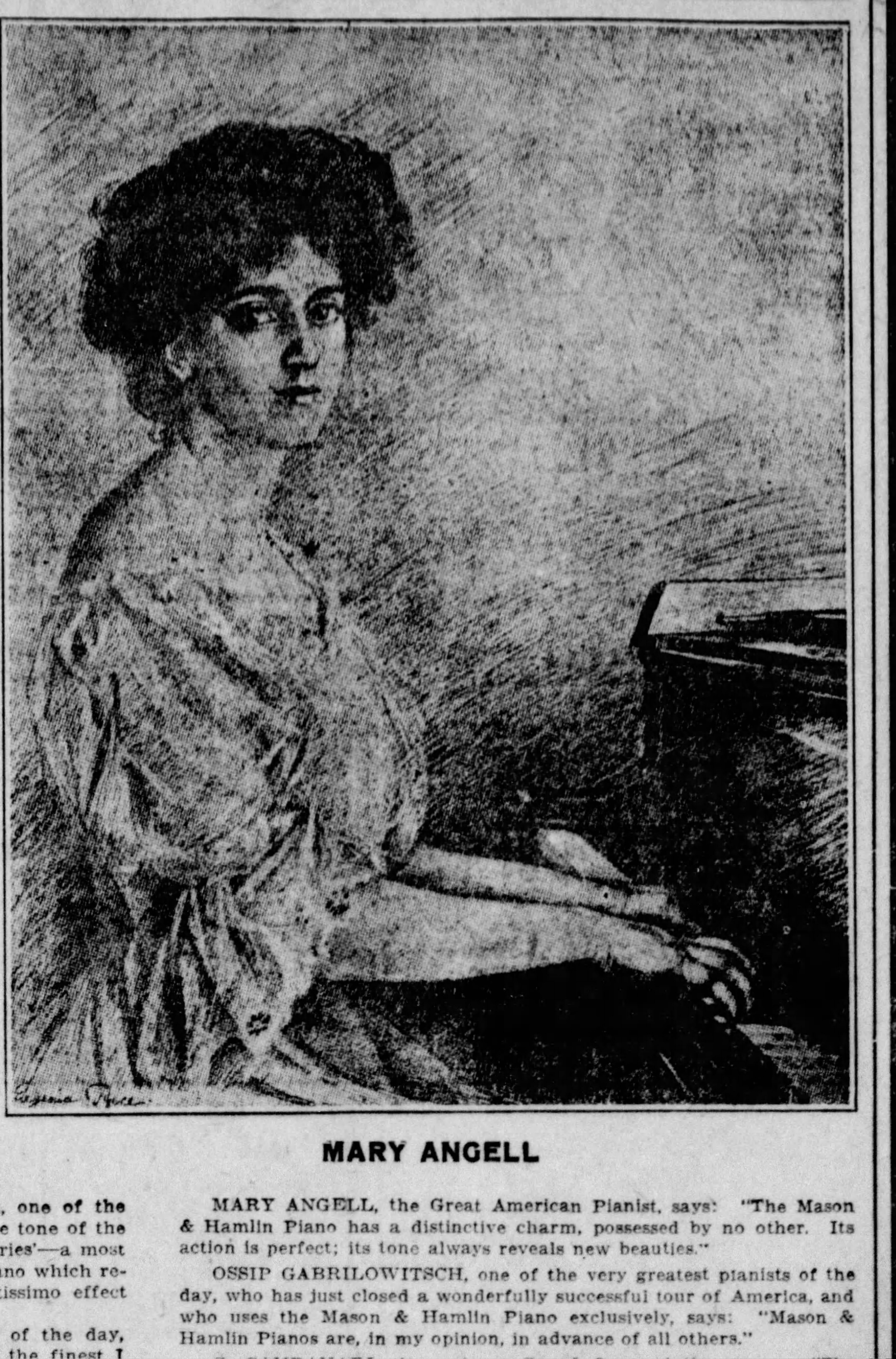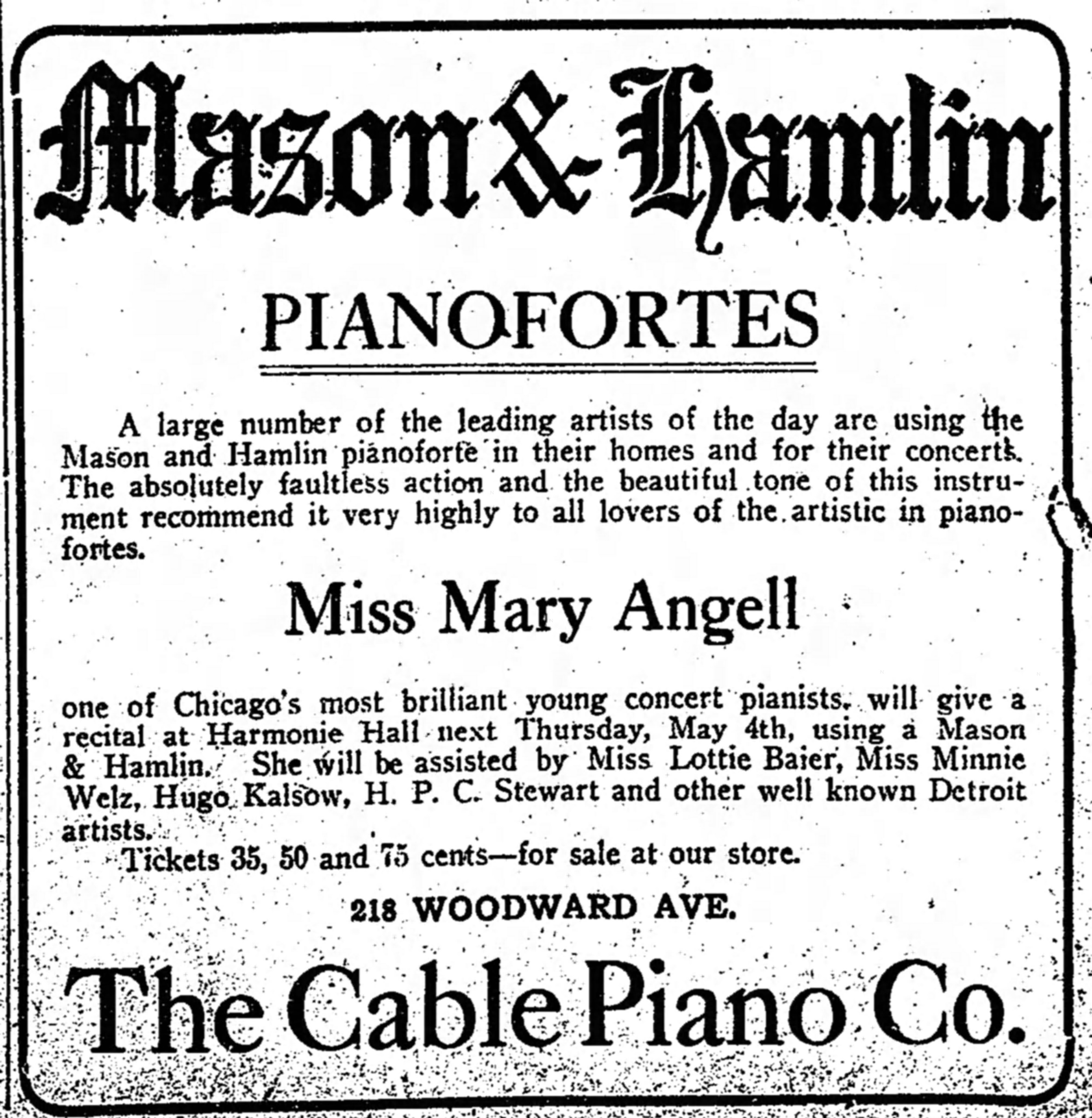 The Cable Company ran a large ad in The Shreveport [LA] Times of June 16, 1907 that featured a somewhat romanticized drawing of Mary Angell and included her endorsement of Mason and Hamlin pianos. Cable had bought a controlling interest in Mason and Hamlin in 1904, and sold the company to the American Piano Company (makers of the AMPICO) in 1924.