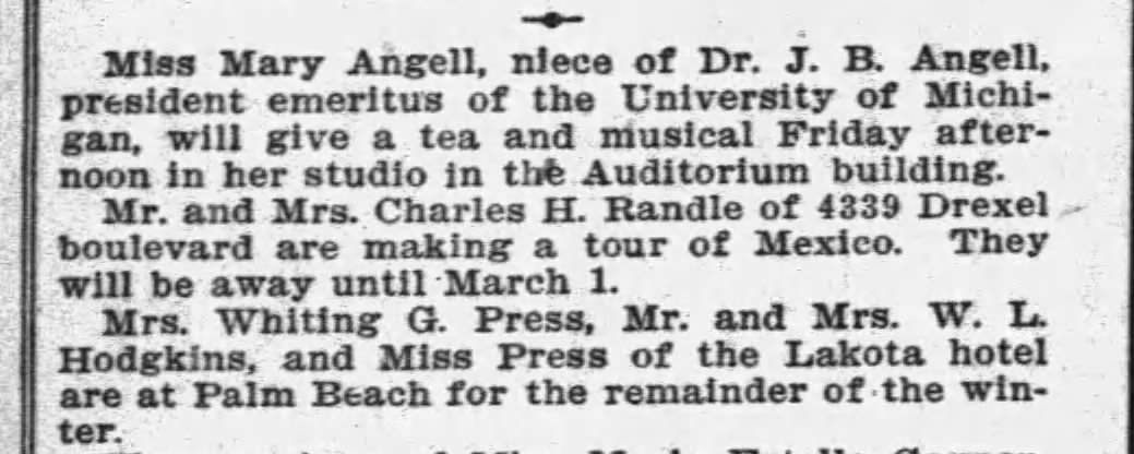 Mary Angell on the program 1910 Chicago Tribune 19100211p8