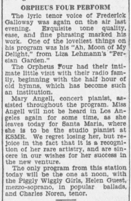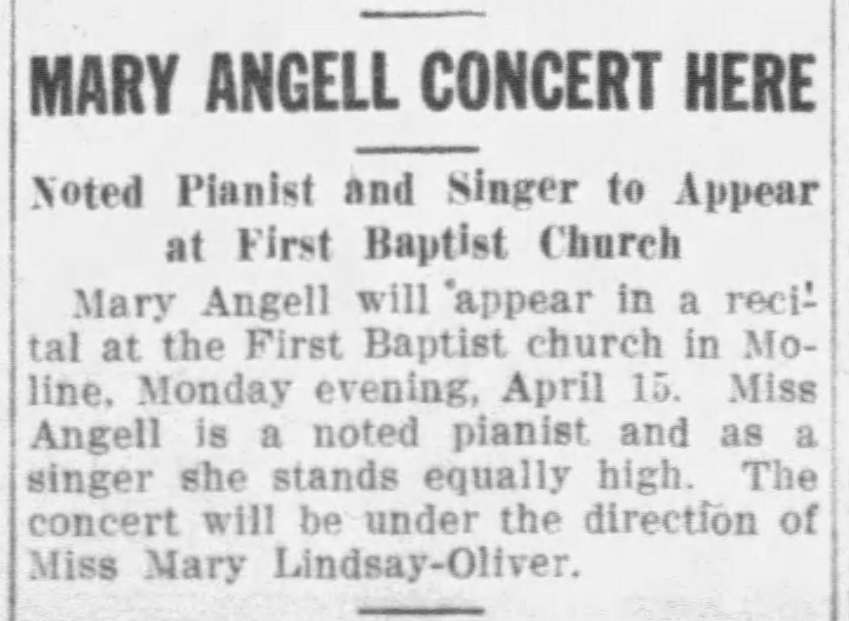 Can you provide some citations for these press reports? I must say, when I do a newspapers.com search, the only mentions I can turn up of a pianist of this name (Mary Angell - I bet you got "autocorrected" into "Angel" in your comment) are in, of course, Cable Co. advertising material. I recall having looked before, too, and I really never turned up anything, so naturally, I'm very interested!