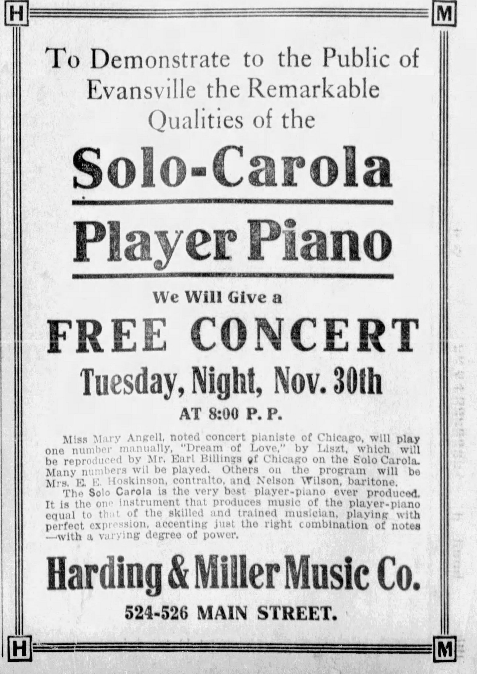 By 1915, Mary was playing in "comparison concerts" to market reproducing piano systems, in this case Cable's Solo-Carola system. (The_Evansville (IN)_Courier_Thu__Nov_25__1915)
