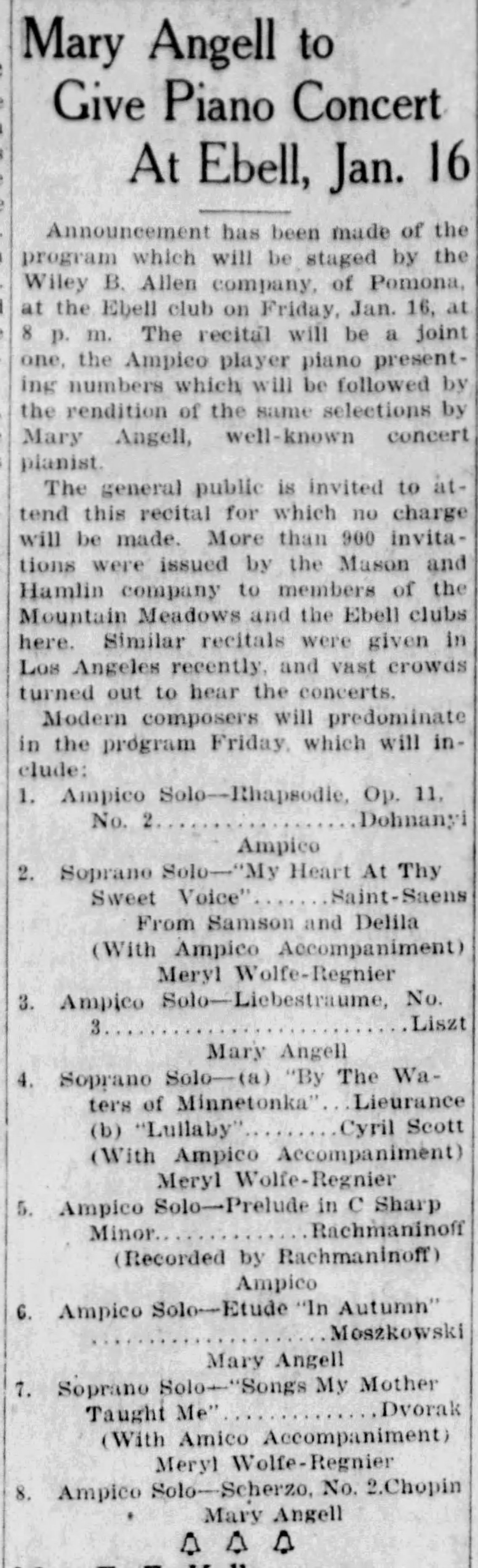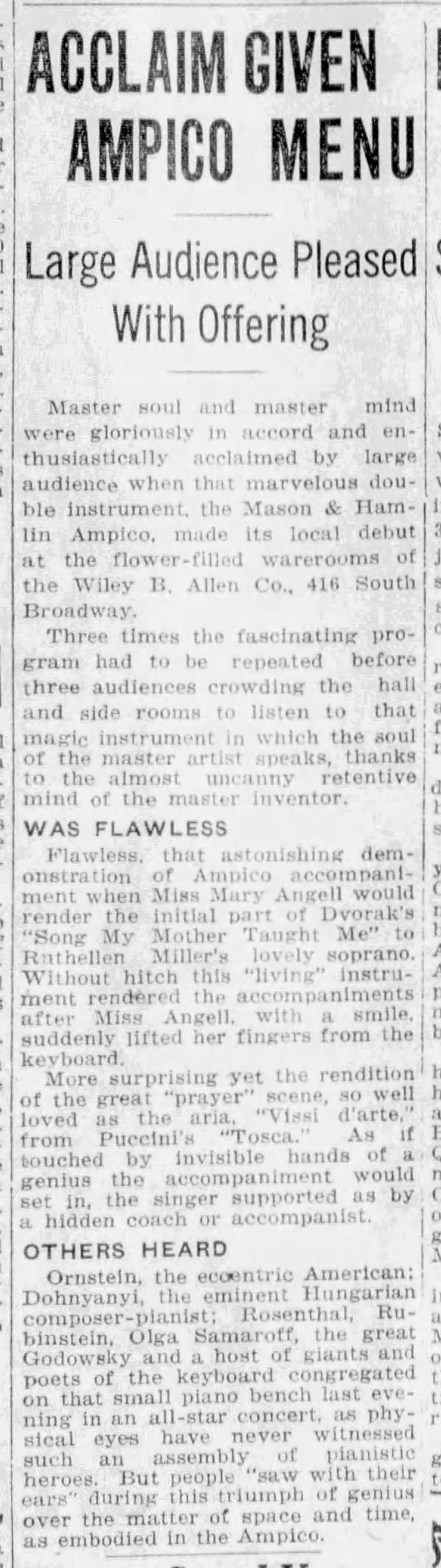 At some point in the 1920s, Mary Angell moved from Chicago to Los Angeles. One might speculate that after her father died at the beginning of 1922 and coincidentally QRS bought out the 88-note roll business of Imperial at the same time, there was much less keeping Mary in Chicago. When Mason and Hamlin was sold by Cable to the American Piano Company in 1924, it seems Mary's affiliation with the Mason and Hamlin meant that she was employed occasionally by AMPICO in the marketing of that system. In 1924-1925, Mary appeared in several AMPICO 'comparison concerts' in the Los Angeles area, clearly a standard marketing technique for the company, complete with the signature moment described in the following article that involves the artist suddenly raising their hands from the keyboard "with a smile" as the instrument plays uninterruptedly. One imagines the gasp of the audience.